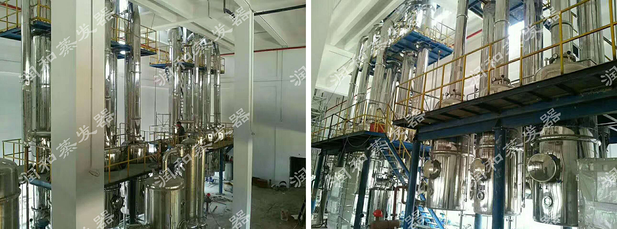 设备由各效蒸发器、各效分离器、冷凝器、热压泵、真空及排水系统、各效料液输送泵、操作平台、电器仪表控制柜及阀门、管路等系统组成。