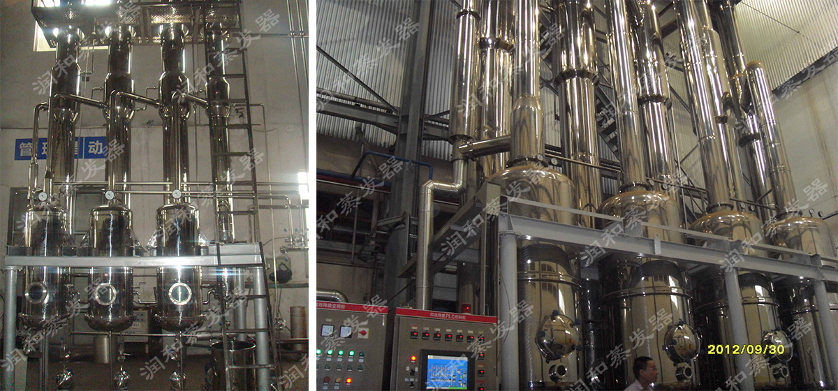 设备由各效蒸发器、各效分离器、冷凝器、热压泵、真空及排水系统、各效料液输送泵、操作平台、电器仪表控制柜及阀门、管路等系统组成。