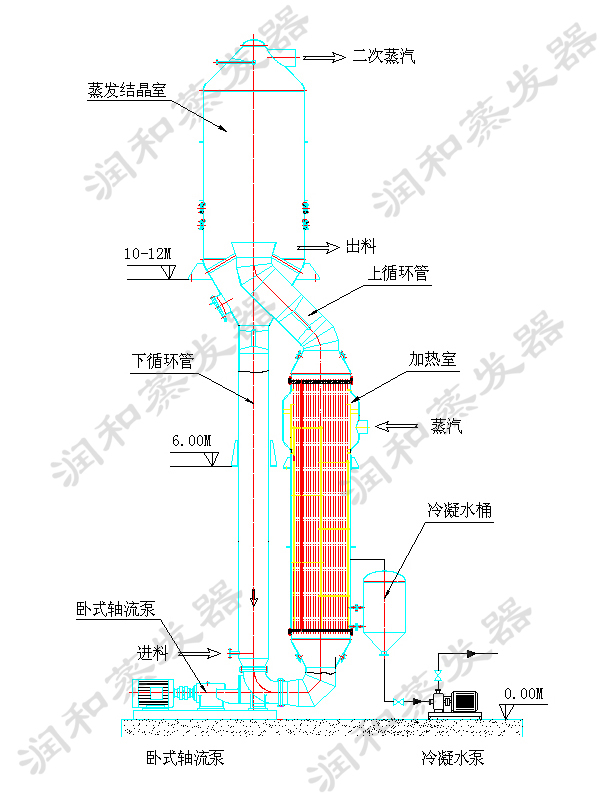 蒸发器、分离结晶器、冷凝器、真空泵、料液泵、冷凝水泵、操作平台、电气仪表及阀门、 管路等系统组成。