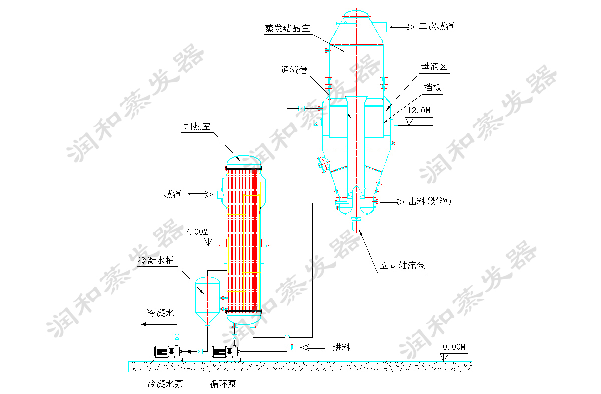 它由加热室、蒸发结晶室、循环泵、立式轴流泵、结晶区、蒸发区、母液区(挡板)组成。