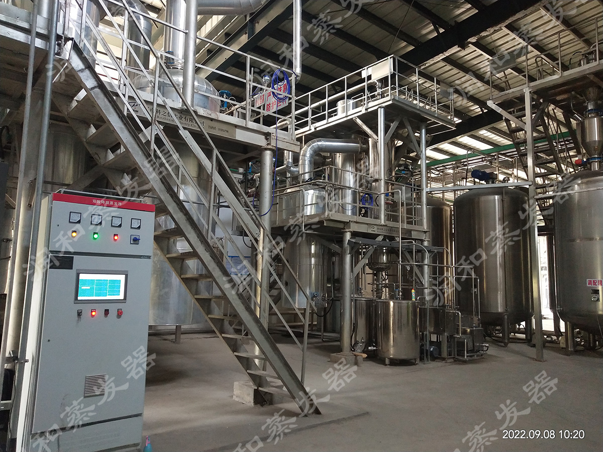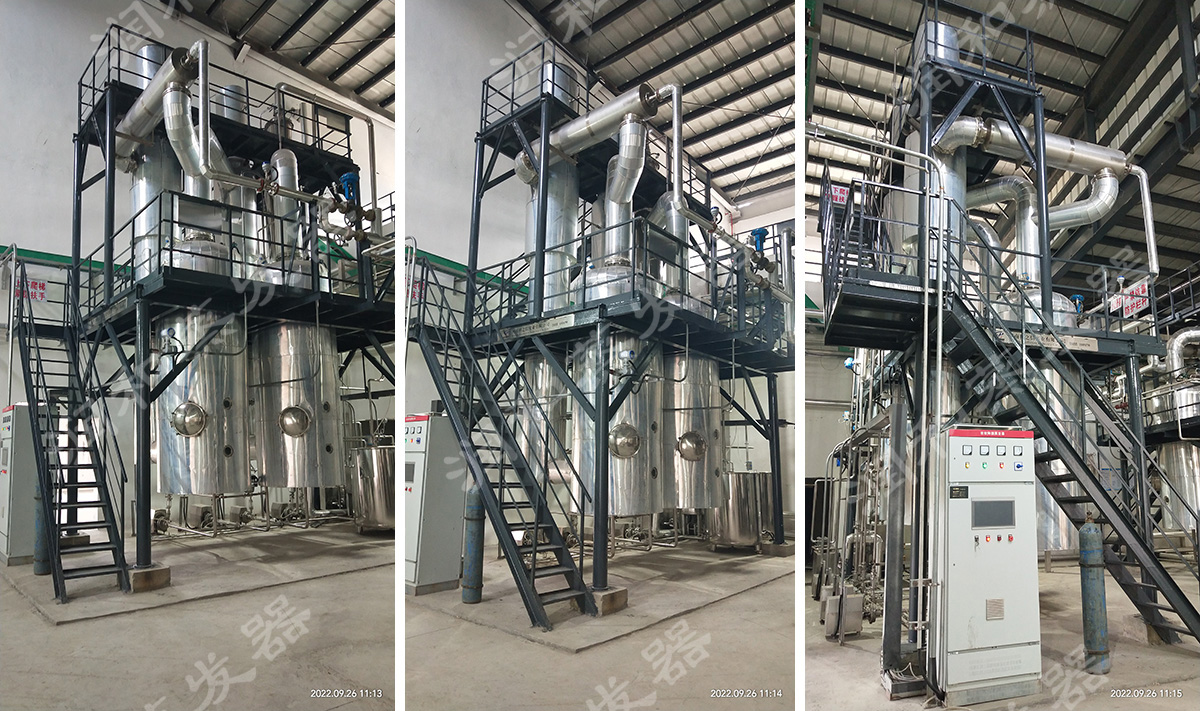设备由各效蒸发器、各效分离器、冷凝器、热压泵、真空及排水系统、各效料液输送泵、操作平台、电器仪表控制柜及阀门、管路等系统组成。